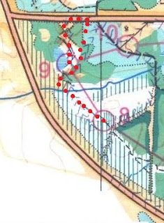 | Yellow dots show my plan to approach Control #12. I should get off trail after the trail bends right. However, I did not estimate my starting position on trail correctly, so a big mistake was made. |