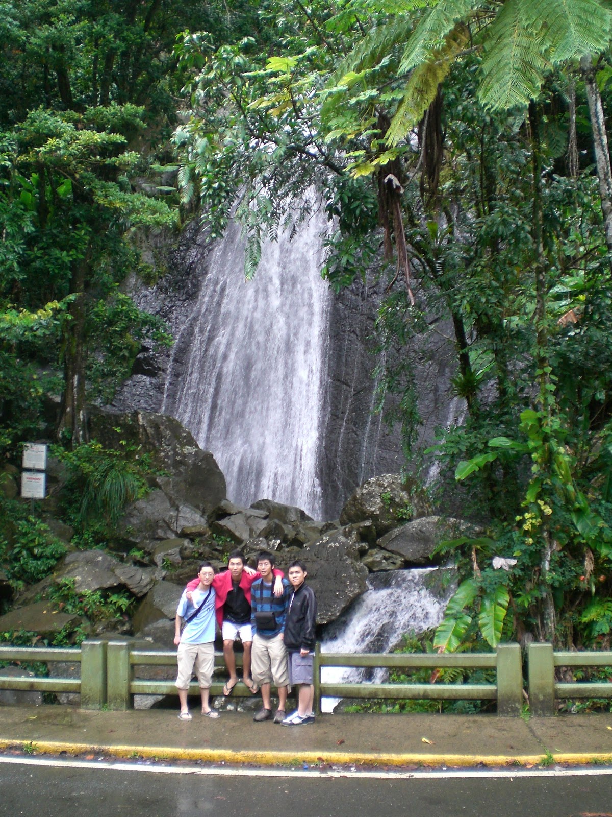 車到了雨林的入口。我們先到詢問處查考值得逗留的地方,然後就繼續坐車。這個熱帶雨林有一條上山的車路,山頂的高度為1078m。我們可以在某些地方泊車,觀看景色,然後繼續上山。第一處令我們想停下來的是一條瀑布,有人在瀑布面前拍照,所以我們都一起在瀑布下拍照。接著我們在一座塔下停車。我們想著登上塔頂,遠眺四周景色,可是因大霧關係,甚麼都看不到。車再上到一處,我們走了約15分鐘路去望一條瀑布。這條山路給我一個在熱帶雨林的感覺,除了周圍都是綠色植物外,路旁是一條水源充足的小溪,磨擦岩石,發出河流的聲響。而且到處都有動物的踪跡,有雀鳥聲,碰到蜘蛛絲,和見到蝸牛。回到車上的途中下大雨,幸好有小亭供我們躲避。
