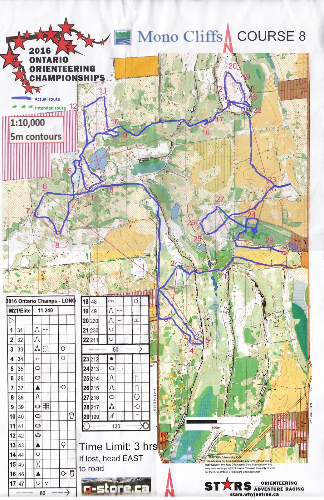 Seeing that I could handle 10 km course last time in Cincinnati, I decided to take the M21 course, which is ~11 km long. The map, Mono Cliff, is at ~1 hour north of Toronto. I had an impression that maps in Canada are fun (read: complicated) to navigate. I hope I should at least enjoy the map.