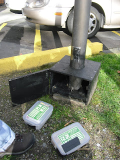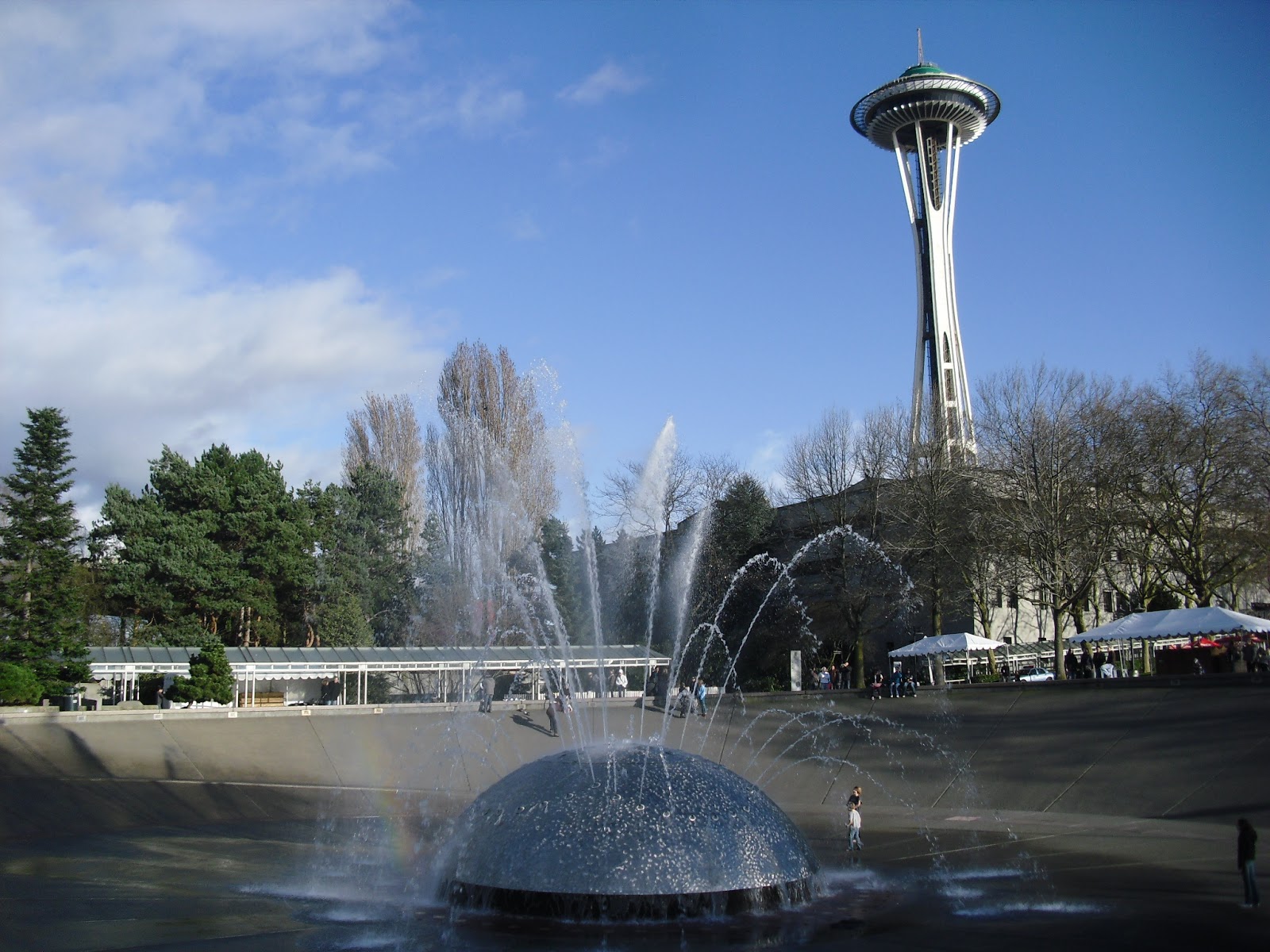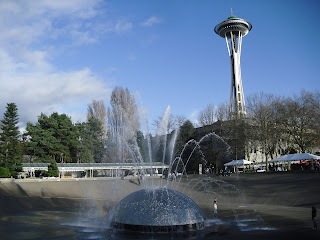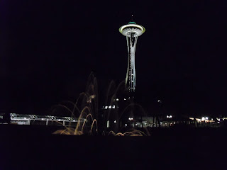 We met other geocachers along the way when we found out some people appeared to be searching for something, only to find a non-geocacher (aka muggle) blocked the cache location. This location is close to a huge water fountain in front of the Space Needle, so it is a good place for pictures. We also found a huge lamppost cache that had a lamppost skirt in a non-traditional way.
