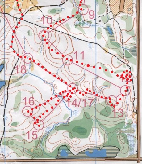 There was nothing much to write about these legs (control 10 to 18). These controls were not too hard to find. I think I can do better on some of the legs (e.g. 11à12, 16à17). I did not hit the right spot when I went to control 12, and I hesitated my running to control 17. Perhaps if I ran close to the re-entrants from control 11, I could identify the location of control 12 more accurately.