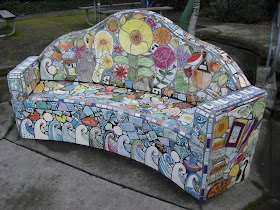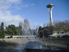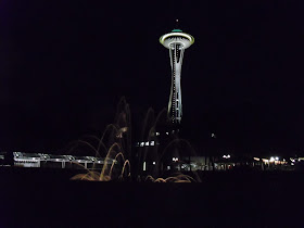 We met other geocachers along the way when we found out some people appeared to be searching for something, only to find a non-geocacher (aka muggle) blocked the cache location.  This location is close to a huge water fountain in front of the Space Needle, so it is a good place for pictures. We also found a huge lamppost cache that had a lamppost skirt in a non-traditional way.