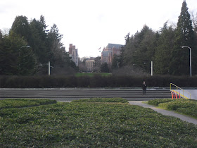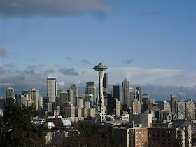 Then, we walked uphill in the Queen Anne area.  Our goal was just to find geocaches before sundown, but we walked to an area that has a great scenery of Seattle downtown.  There also seemed to be many tourists using their cameras.