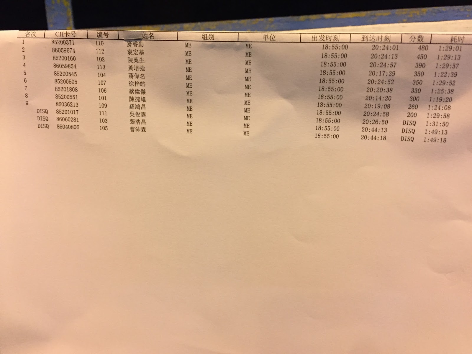 I went back to the event center to print the results, pick up the key for lodging in Ming Fai Camp, and pick up a cup noodle (without a fork), a cake, and a carton of juice for tonight's dinner and tomorrow's breakfast (certainly not enough for me). Then, I looked at the preliminary results. Huh? Nobody got over 400 points? Even when the result was final, there were only 2 people got over 400 points, and I was one of them.