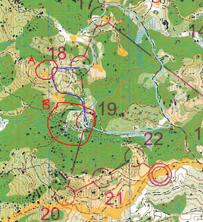 It was #19 and #20 that killed me. To #19, I wondered if anybody was scared of the wood, and took the light blue route. These people will certainly be faster than me. I was totally at fault for #19. I thought about going west a bit, and when I saw a trail going south, I took that route. I did not see that, but I saw the open area (circle A on the left below). That was still not too bad. I could just find a way to go south.