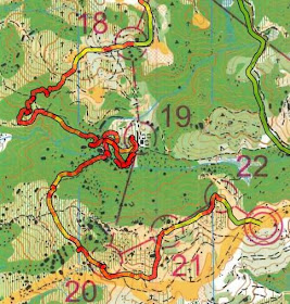 It was #19 and #20 that killed me. To #19, I wondered if anybody was scared of the wood, and took the light blue route. These people will certainly be faster than me. I was totally at fault for #19. I thought about going west a bit, and when I saw a trail going south, I took that route. I did not see that, but I saw the open area (circle A on the left below). That was still not too bad. I could just find a way to go south.