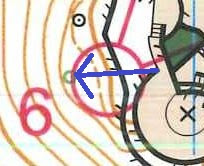 One needs to walk all the way back to Control #6 to view from the top. From this point, the re-entrant may be easier to see, by looking at the two possible spurs (on the picture one quarter to the right, and about half between top and bottom). Then, one can decide that the re-entrant does not have a flag.