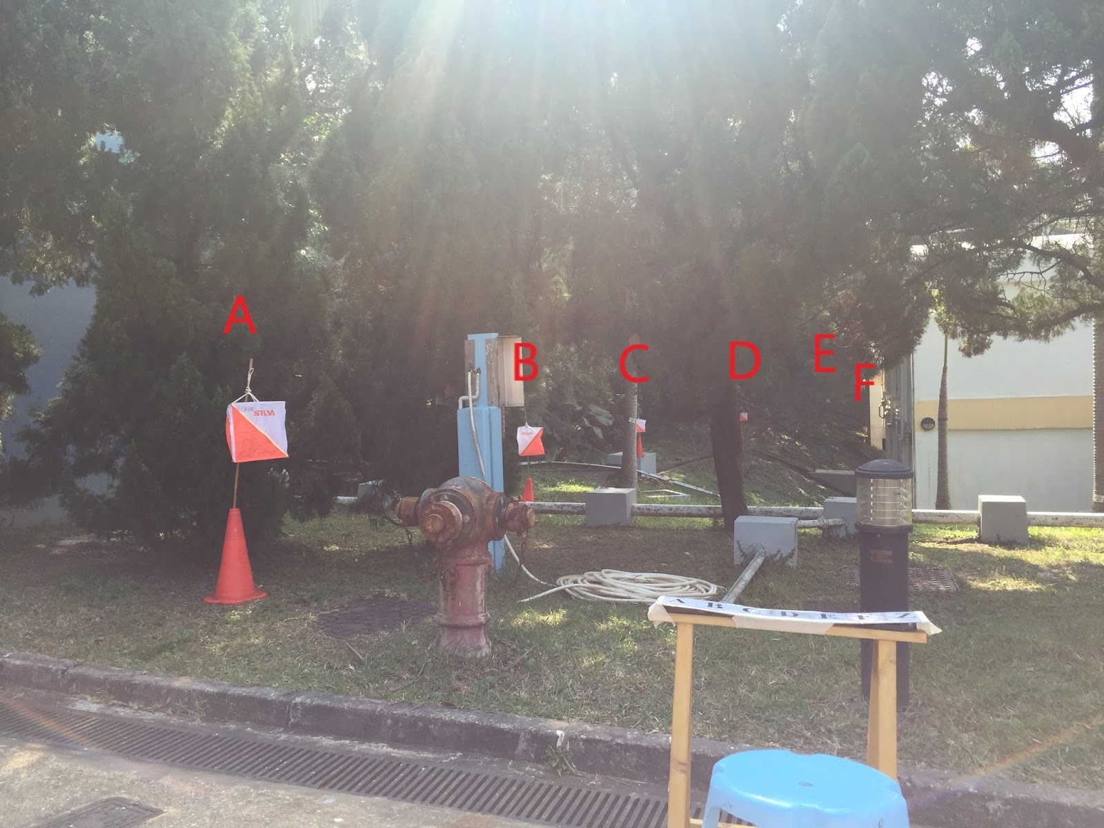 Question 1: The thicket is in front of a building, so it is very close to where I sit. Flag A may not look exactly north of the thicket, but as long as the description is not at the opposite side, the answer is considered to be correct (in Temp-O, a +/- 90 deg of error in a control description is allowed). Thus, the answer is A.